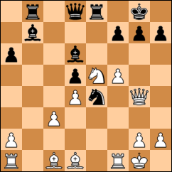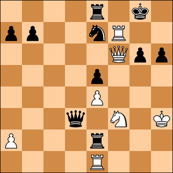 Solución: ( 1...Dd7+! 2.Rg3 Cf5+! 3.exf5 Dxf7 Librándose del mate inminente. 4.Dxf7+ Rxf7 5.Txe2 Con equivalencia de material. )